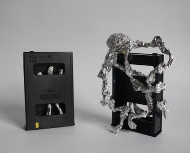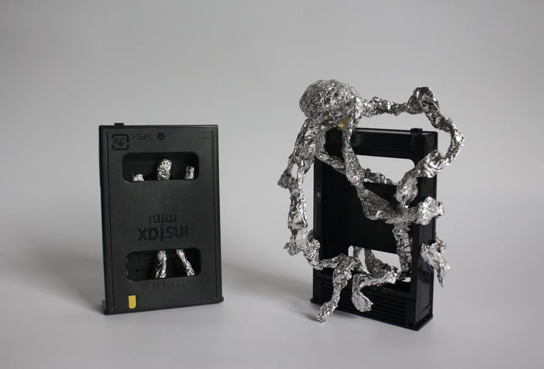 Der Film meiner Polaroidkamera musste ausgetauscht werden und die leere Filmpackung schien mir viel Potenzial zu bieten. Nach einigen Überlegungen kam mir die Idee, aus Alufolie kleine Skulpturen zu formen, welche sich mit dem Polaroidfilm verbinden ließen. So entstanden ein Quallenwesen, was sich um den Leerfilm windet, sowie eine kleine Person, welche in dem Film gefangen schien.