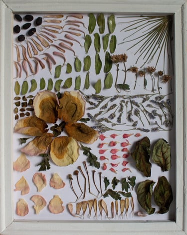 Um den ersten Blumenstrauch, welchen ich als verheiratete Frau geschenkt bekommen habe, zu verewigen, experimentierte ich mit den vertrockneten Blumen als Material. Entstanden ist eine abstrakte Anordnung der Elemente, aufgeklebt auf Pappe und in einen glaslosen Rahmen platziert..