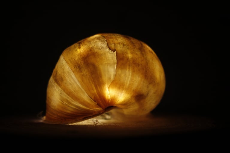 Von der Sonne zu einem Spaziergang motiviert, stach mir am Wegesrand ein kleines Schneckenhaus ins Auge. Gegensätzlich zu meinem ersten Impuls es malerisch zu gestalten, fiel mir dessen Transparenz auf. So entstand ein leuchtendes Schneckenhaus.