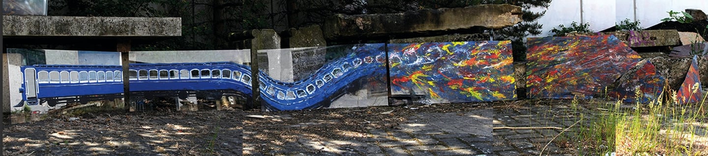 Angeregt von schwarz-weiss Fotos einer ausgebrannten Straßenbahn, stellte ich in einer 5-teiligen Abfolge von transparenten Bildtafeln den Prozess der Zerstörung bis zur völligen Auflösung der Waggons dar. Die malerischen Einzelpaneele bewegen sich zunehmend in die Ausstellungskonstruktion hinein, um schließlich in zersplitterter Form in ihr aufzugehen.
