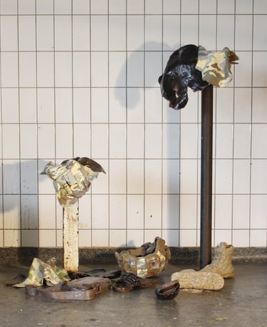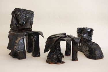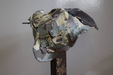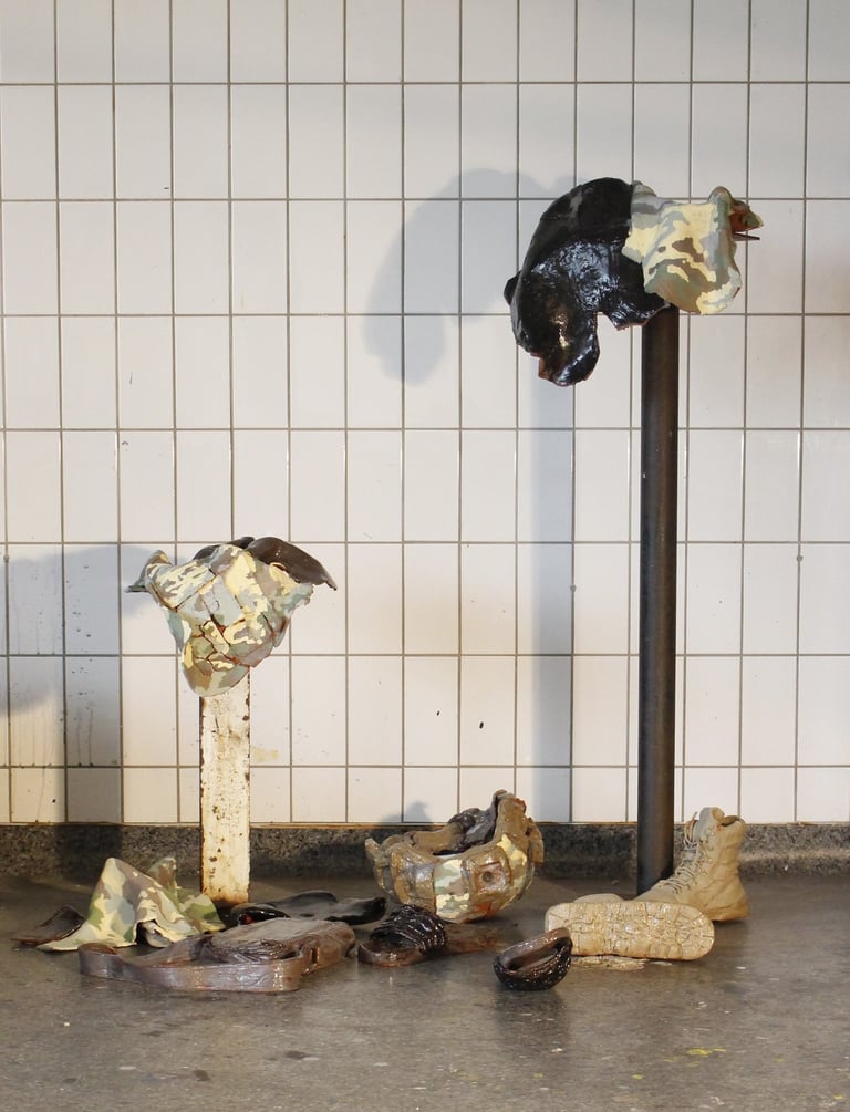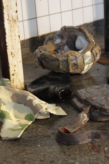 Die aus zehn Teilen bestehende Keramikarbeit bildet eine Chaosecke aus eigener Garderobe und den Militärklamotten meines Mannes. Auf diese Weise habe ich das bevorstehende Zusammenziehen künstlerisch eingeleitet.