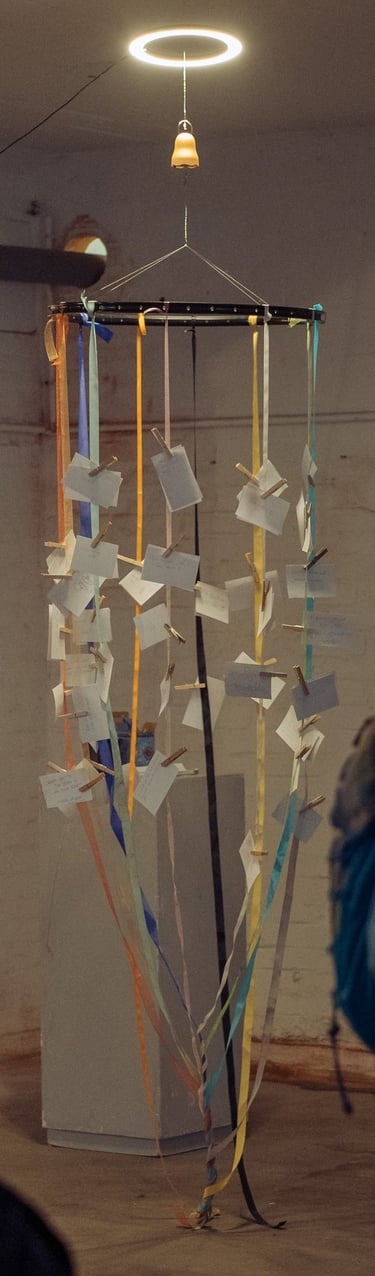 Das Gedankenkarusell ist eine Fahrradspeiche an welcher Geschenkbänder hängen. Das Werk dreht sich und Besucher*innen sind dazu angehalten, ihre Gedanken aufzuschreiben und an das Karussell mit Wäscheklammern zu klemmen.
