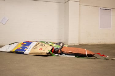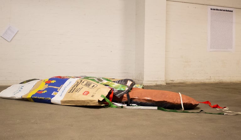 Die Labertasche ist eine Skulptur, welche aus 13 Einkaufstaschen genäht wurde. Sie beinhaltet einen Lautsprecher um dich vollzulabern. Größe: ca. 2m x 2m