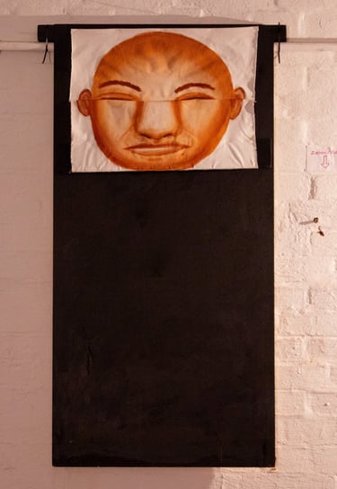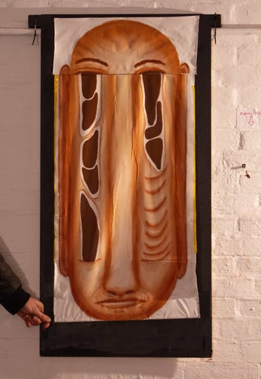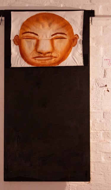 Das „lange Gesicht machen“ ist ein Gemälde auf Stoff, welches langge -zogen werden muss, um die gesamte Malerei betrachten zu können.