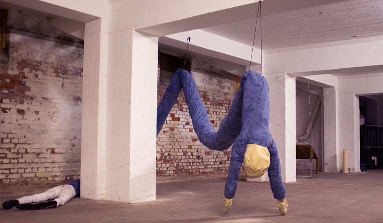 „sich hängen lassen“ ist eine von handgenähte Puppe, welche mit Papierresten gefüllt wurde.
